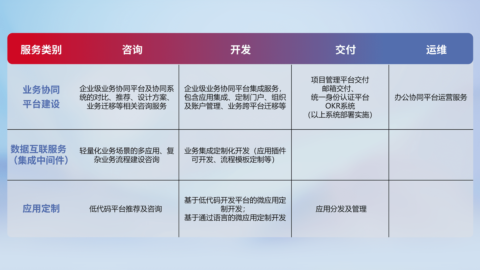 针对钉钉、、、、企微、、IDaas等平台级产品提供产品的规划、、、、方案、、交付、、、、定制化开发等服务,,实现如统一协同办公、、、、智能客户服务、、、混合会议管理、、、智能数据查询、、、等业务场景,,,,实现数字化转型。。